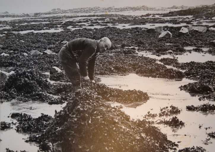 Vue d'un cultivateur de Lanmodez, Paul Kerleau, utilisant une faucille à goémon traditionnelle pour couper les algues de rive, 1980Immatriculation