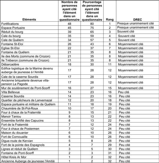 Tableau de Degré de Reconnaissance Patrimoniale (par la population enquêtée) des éléments cités à RoscanvelImmatriculation