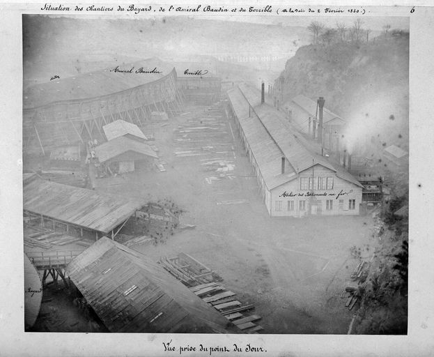 Vue de l'arsenal de Brest en 1880 depuis le Point du Jour : la Penfeld, les quais. Situation des chantiers du Bayard, de l'Amiral Baudin et du Terrible (2 février 1880). Atelier des Bâtiments en ferImmatriculation