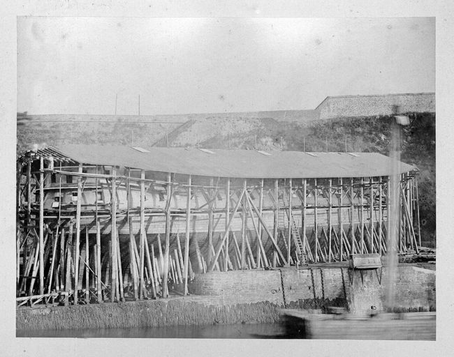 Vue de l'arsenal de Brest en 1880 : la Penfeld, les quais et les cales dite de la Boucherie. Construction navale, le Bayard sur la cale n° 2. Sur la falaise : les fortifications et la prison du Bouguen via l'escalierImmatriculation