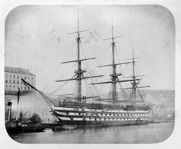 Vue de l'arsenal de Brest en 1880 : la Penfeld, le quai, la Salle d'armes, les formes de Pontaniou et la Caserne des Marins. Le navire à voile Borda est à quaiImmatriculation