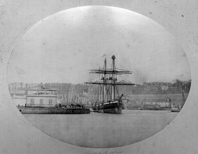 Vue de l'arsenal de Brest en 1880 : navire à quai au port de commerce sous le Cours Dajot. Corvette russe à propulsion mixte (voile et vapeur)Immatriculation