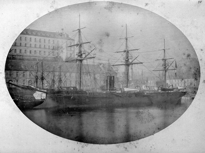 Vue de l'arsenal de Brest en 1880 : la Penfeld, le quai, la Salle d'armes, les formes de Pontaniou et la Caserne des Marins. Le navire à propulsion mixte (voile et vapeur) Lapérouse est à quaiImmatriculation