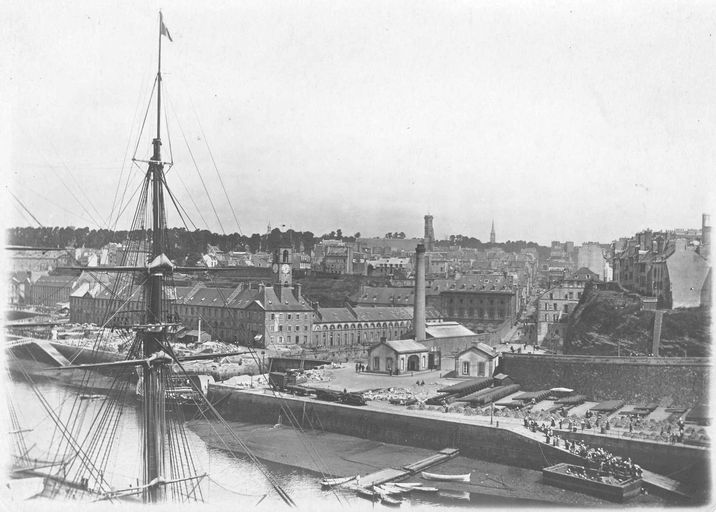 Vue de l'arsenal de Brest vers 1880 : porte Tourville, magasin de la machine d'épuisement (pompe), forme de construction, bassin de radoub de Troulan dit forme de Brest, magasin général. Axe de la rue PasteurImmatriculation