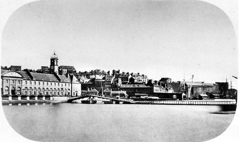 Vue de l'arsenal de Brest en 1859 : de gauche à droite, le Magasin Général, le pont flottant traversant la Penfeld, la grue à mâter et le châteauImmatriculation
