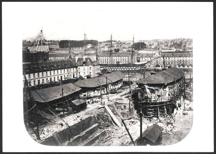 Vue de l'arsenal de Brest en 1859 (?) : formes de construction, bassins de radoub de Pontaniou dits formes de Pontaniou. Au deuxième plan sur l'autre rive de la Penfeld : le Magasin GénéralImmatriculation