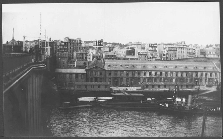 Vue de l'arsenal de Brest en 1890 : bâtiments logistiques. En arrière-plan : le quartier de Recouvrance. A gauche : le Pont National et la tour TanguyImmatriculation