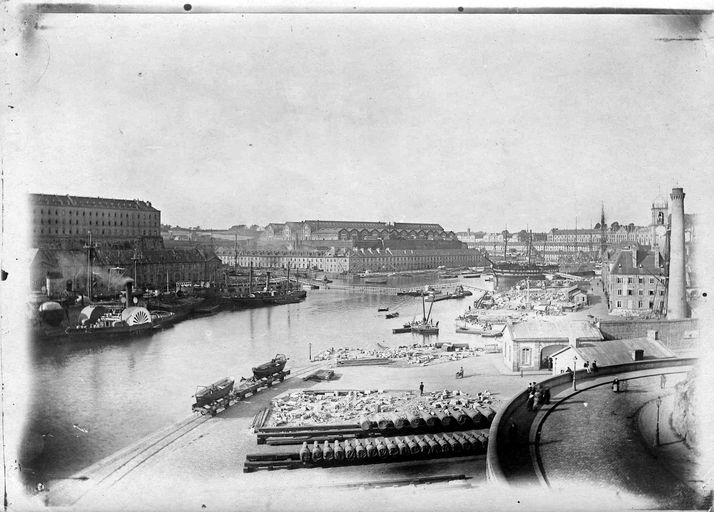 Vue de l'arsenal de Brest vers 1880 : le quai et les deux corps de garde de la porte Tourville, les bâtiments logistiques de l'arsenal. En arrière-plan : les ateliers du plateau des CapucinsImmatriculation