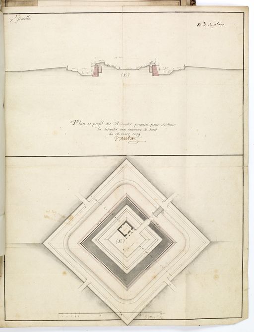 Plan et profil des redoutes proposées pour soutenir les descentes aux environs de Brest, 16 mars 1689, signé par Vauban. Bibliothèque du Génie, Manuscrit in f°33g tome 2 atlasImmatriculation