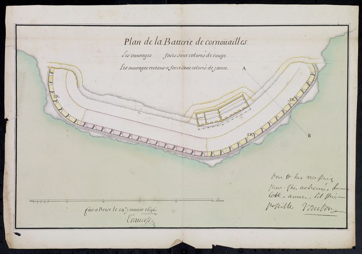 Plan de la batterie de Cornouaille, fait à Brest le 24 janvier 1696 par Traverse contresigné par VaubanImmatriculation