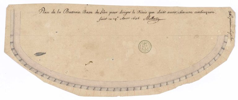 Plan de la batterie de Léon, fait à Brest le 24 août 1686 par Mollart. Plan de la batterie basse de Léon pour diriger le biais que doit avoir chacune embrazureImmatriculation