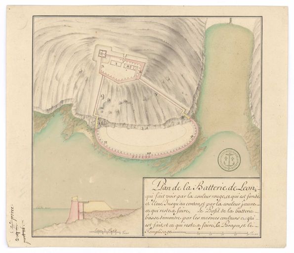 Plan de la batterie de Léon, fait en 1686 par Mollart. Plan général et profil des projets pour 1687Immatriculation