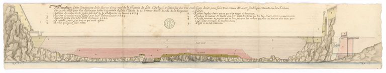 Plan de la batterie de Léon, fait en 1686 par Mollart. Elévation et profil du parement de la batterie basse où sont distingués les travaux faits en 1684, 1685, 1686 et ceux qui restent à faireImmatriculation