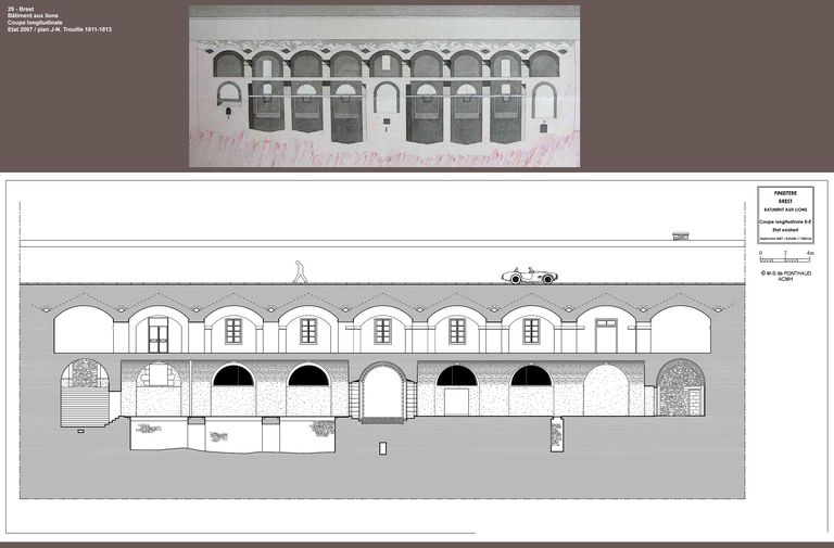 Coupe longitudinale E-E', état existant, septembre 2007. Plan de Jean-Nicolas Trouille, 1811-1813 (extrait de l'étude préalable à la restauration de Marie-Suzanne de Ponthaud, Architecte en Chef des Monuments Historiques)Immatriculation