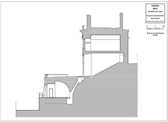 Coupe transversale D-D', état existant, septembre 2007 (extrait de l'étude préalable à la restauration de Marie-Suzanne de Ponthaud, Architecte en Chef des Monuments Historiques)Immatriculation