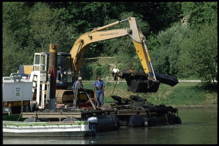 Vue de la Penfeld en 1993 : dragage de la Penfeld. Bois immergé de construction navaleImmatriculation