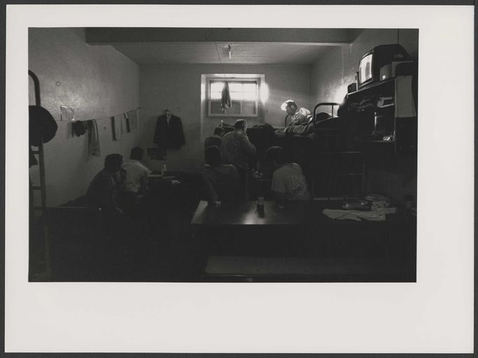 La prison de Pontaniou par Bruno Ravalard, 1989 : une cellule avec les détenus photographiés de dosImmatriculation