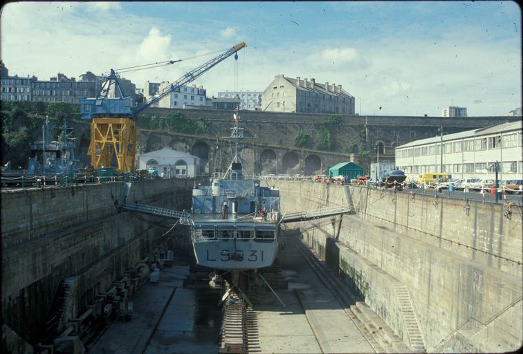 Vue de l'arsenal de Brest en 1980 : un navire dans la forme de construction, bassin de radoub nord de Pontaniou dit forme de Pontaniou. En arrière-plan : la levée de Pontaniou et le bâtiment aux LionsImmatriculation
