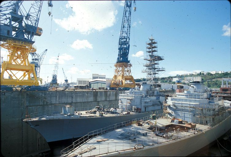 Vue de l'arsenal de Brest en 1980 : formes de construction, bassins de radoub de Laninon dits bassins de Laninon (n° 8 et 9). Deux navires militaires en cale sècheImmatriculation