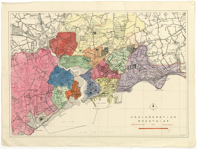 Délimitation des paroisses de l'agglomération brestoise : Saint-Pierre, Bergot, Le Landais, Kerdonne, Recouvrance, Bouguen, Saint-Louis, Saint-Marc, Pilier Rouge, Saint-Trichet, Lambézellec, KérinouImmatriculation