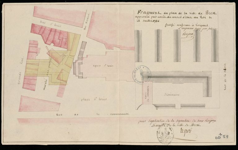 Plan d'ensemble de l'église Saint-Louis et du Séminaire : projet de voirie, aménagement d'une avenue, 28 juillet 1786 par Voyer, ingénieur par intérim. Signé par Roujoux, maire de la ville de BrestImmatriculation