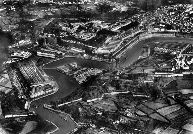 Vue aérienne oblique de Brest en 1926 : la Penfeld au niveau des portes de l'arrière-garde et de Quéliverzan. L'arsenal, les fortifications, les bâtiments en fer et les ateliers du plateau des CapucinsImmatriculation