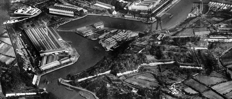Vue aérienne oblique de Brest en 1926 : la Penfeld au niveau des portes de l'arrière-garde et de Quéliverzan. L'arsenal, les fortifications, les bâtiments en fer, la prison du Bouguen, les bassins du SalouImmatriculation