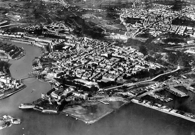 Vue aérienne oblique de Brest en 1926 : l'embouchure de la Penfeld, Brest même (rive gauche), le château, les fortifications et le pont tournant. A signaler : les retouches de l'image pour vider la Penfeld de ses bateaux de guerreImmatriculation