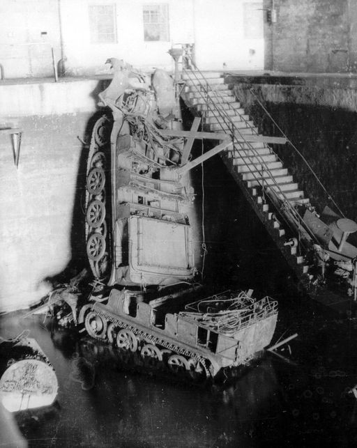 Vue intérieure de la base de sous-marins : deux auto-tracteuses allemandes ont été basculées dans l'une des alvéolesImmatriculation