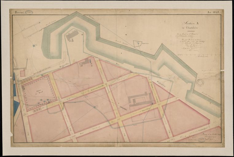Section A de l'Harteloire : nouvelle enceinte, projet de quartier et voirie ; réseau de distribution d'eau, fait à Brest le 22 juillet 1848 par l'architecte Voyer signé par Pouliquen ; vu au Conseil Général des bâtiments civils à Paris le 12 mars 1849Immatriculation