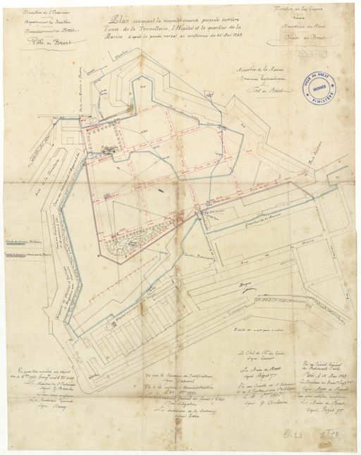 Plan indiquant la nouvelle enceinte proposée derrière l'anse de la Tonnellerie, l'hôpital et le quartier de la Marine, fait à Brest le 26 mai 1848 (d'après le procès verbal de conférence), vu en 1850 par les ministères de la Guerre et de l'IntérieurImmatriculation