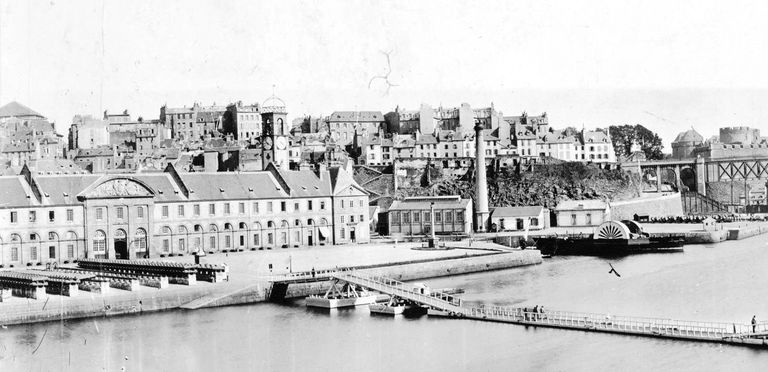 Vue de l'arsenal de Brest vers 1880 : de gauche à droite, le Magasin Général dit la Généralité, Brest même, le château, la Penfeld, le pont flottantImmatriculation