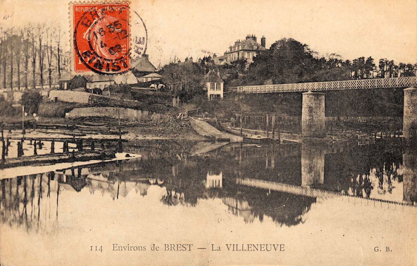 Vue de la Villeneuve, carte postale (Archives municipales de Brest). A droite, la passerelle qui permet de franchir la PenfeldImmatriculation