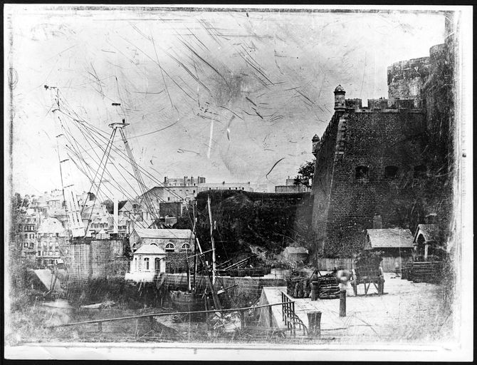 Vue du pied du château de Brest vers 1848 : la Penfeld à marée basse, les quais, les bâteaux de pêche. En arrière plan : la machine à mâter de l'arsenalImmatriculation