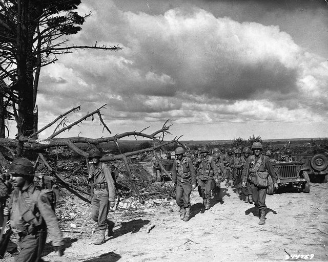 Vue de troupes d'infanterie américaine progressant vers Brest, 16 septembre 1944 (U.S. Army Signal Corps)Immatriculation