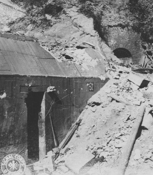 Vue d'un bunker abri à personnel dans la falaise de l'arsenal près des fortifications. Marquage allemand "St" signifiant "Ständig" (permanent)Immatriculation