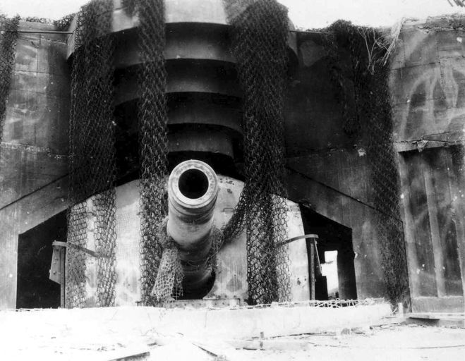Vue d'un canon sous casemate de la batterie lourde codée M.K.B. Graf Spee (4 canons de 280 mm) (Re 303) (5 / M.A.A. 262), septembre 1944 (U.S. Army Signal Corps). Devant l'affût du canon, filets de protection en chaîneImmatriculation