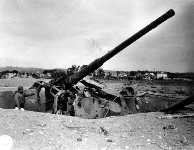 Vue de la festung Brest pendant la bataille de Brest, U.S. Army Signal Corps, septembre 1944 : canon de la batterie antiaérienne codée M.K.B. Zebra (4 canons de 10,5 cm ; 2 canons de 2 cm) (2 / Ma Fla 811)Immatriculation