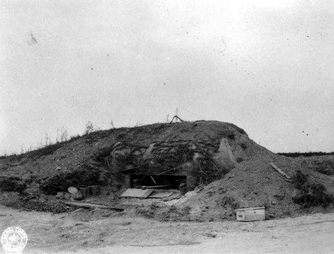 Vue de la festung Brest pendant la bataille de Brest, U.S. Army Signal Corps, septembre 1944 : casemate pour canon antichar située sur la route du Conquet (à proximité du fort Montbarrey) à l'ouest de BrestImmatriculation
