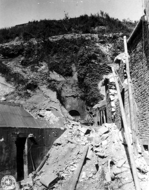 Vue d'un bunker abri à personnel dans la falaise de l'arsenal près des fortifications. Marquage allemand "St" signifiant "Ständig" (permanent)Immatriculation