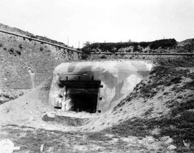 Vue de la festung Brest pendant la bataille de Brest, U.S. Army Signal Corps, septembre 1944 : casemate nord de la batterie de Quéliverzan (4 canons de 10,5 cm de type le.F.H. 325 (f) sous casemate de type 669) (B 18) (1/ H.A.A. 1162)Immatriculation