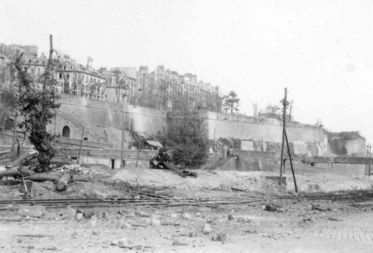 Vue de la festung Brest pendant la bataille de Brest, U.S. Army Signal Corps, septembre 1944 : fortification d'agglomération, front bastionné du Cours Dajot depuis le Port de CommerceImmatriculation
