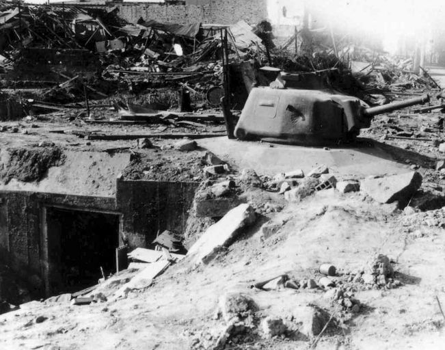 Vue de la festung Brest pendant la bataille de Brest, U.S. Army Signal Corps, septembre 1944 : Tobrouk pour tourelle de char situé à l'entrée de la ville en haut de la rue Jean Jaurès, devant le garage CitroënImmatriculation