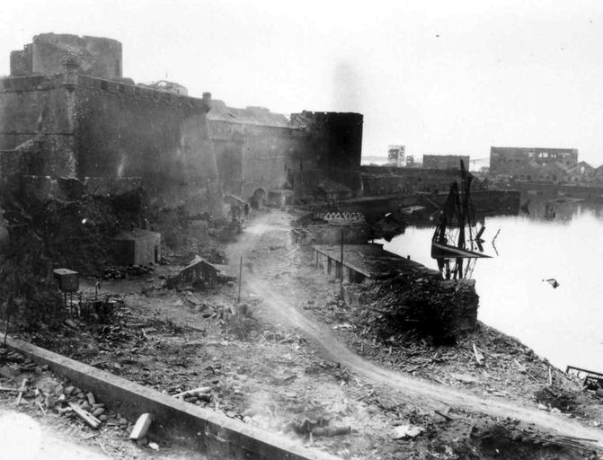 Vue de la festung Brest pendant la bataille de Brest, U.S. Army Signal Corps, septembre 1944 : l'arsenal et le château (bastion Sourdéac)Immatriculation