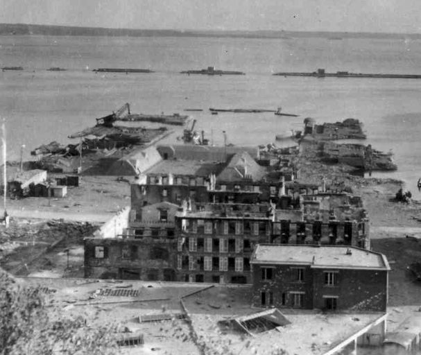 Vue de la festung Brest pendant la bataille de Brest, U.S. Army Signal Corps, septembre 1944 : immeubles détruits, digues du port et abris en béton du Port de Commerce (zone de transit des blessés vers Lanvéoc)Immatriculation