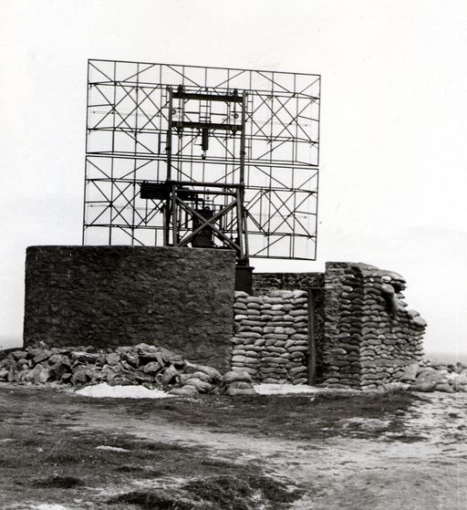 Vue de l'ensemble fortifié du Stiff pendant la Seconde Guerre Mondiale : position de la pointe, encuvement en maçonnerie et radar Seetakt (spécialisé dans le repérage des bâtiments de surface)Immatriculation