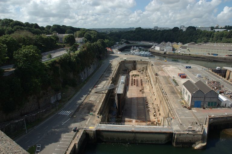 Vue d'ensemble des formes de construction, bassins de radoub actuellement bassins n° 4, 6 et 7 depuis le pont de l'Harteloire : bassin n° 4Immatriculation