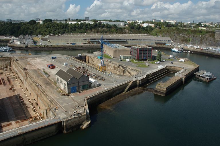 Vue d'ensemble des formes de construction, bassins de radoub actuellement bassins n° 4, 6 et 7 depuis le pont de l'Harteloire : bassin n° 7Immatriculation