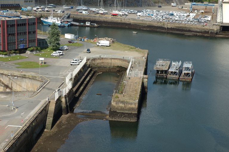 Vue d'ensemble des formes de construction, bassins de radoub actuellement bassins n° 4, 6 et 7 depuis le pont de l'Harteloire : bassin n° 6Immatriculation