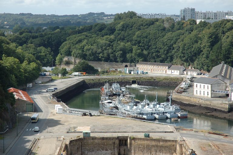 Vue du fond de la Penfeld : l'Arrière-garde. Porte monumentale reliée aux fortifications du Bouguen dit Fort BouguenImmatriculation
